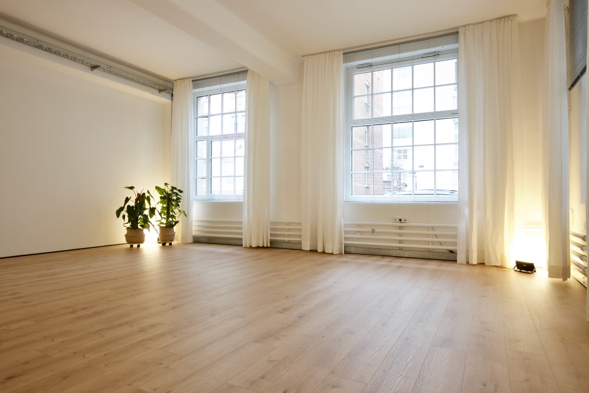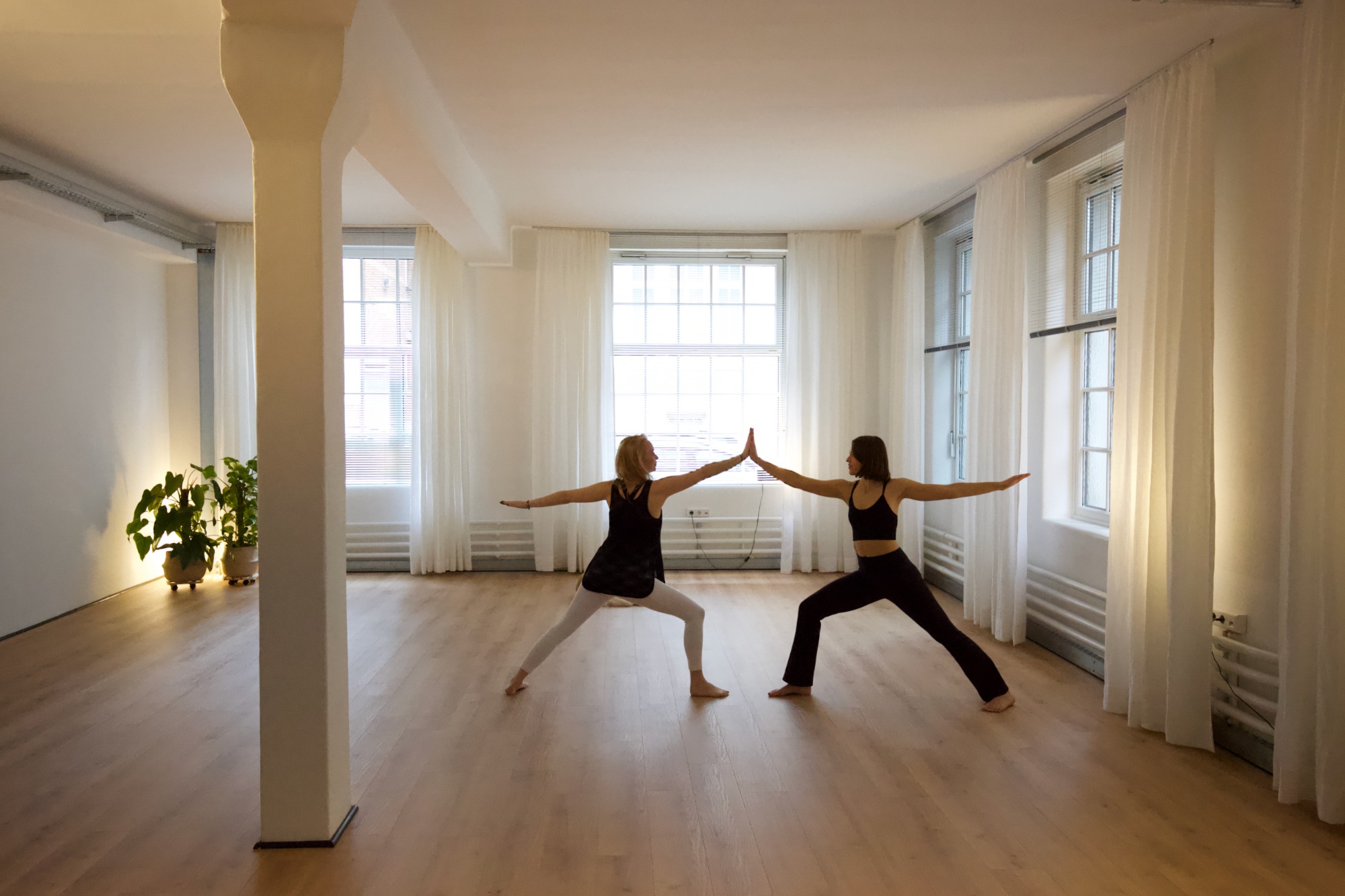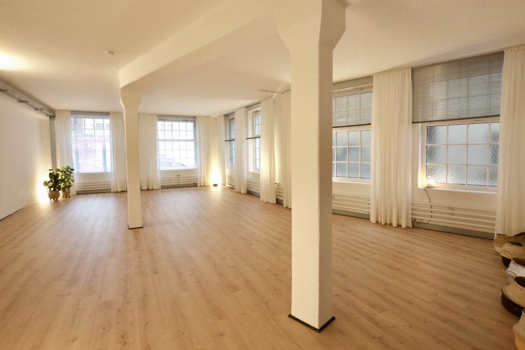 Ein Raum inkl. kompletter Studioausstattung (Matten, Kissen, Decken, Gurte, ...), eine voll ausgestattete Teeküche, Garderobe, WC und eine begrünte Innenhof-Terrasse sorgen für Komfort und Atmosphäre. Hohe Decken, große Fabrikfenster, Eicheparkett und ein modernes Lichtkonzept schaffen ein einzigartiges Loft-Flair.